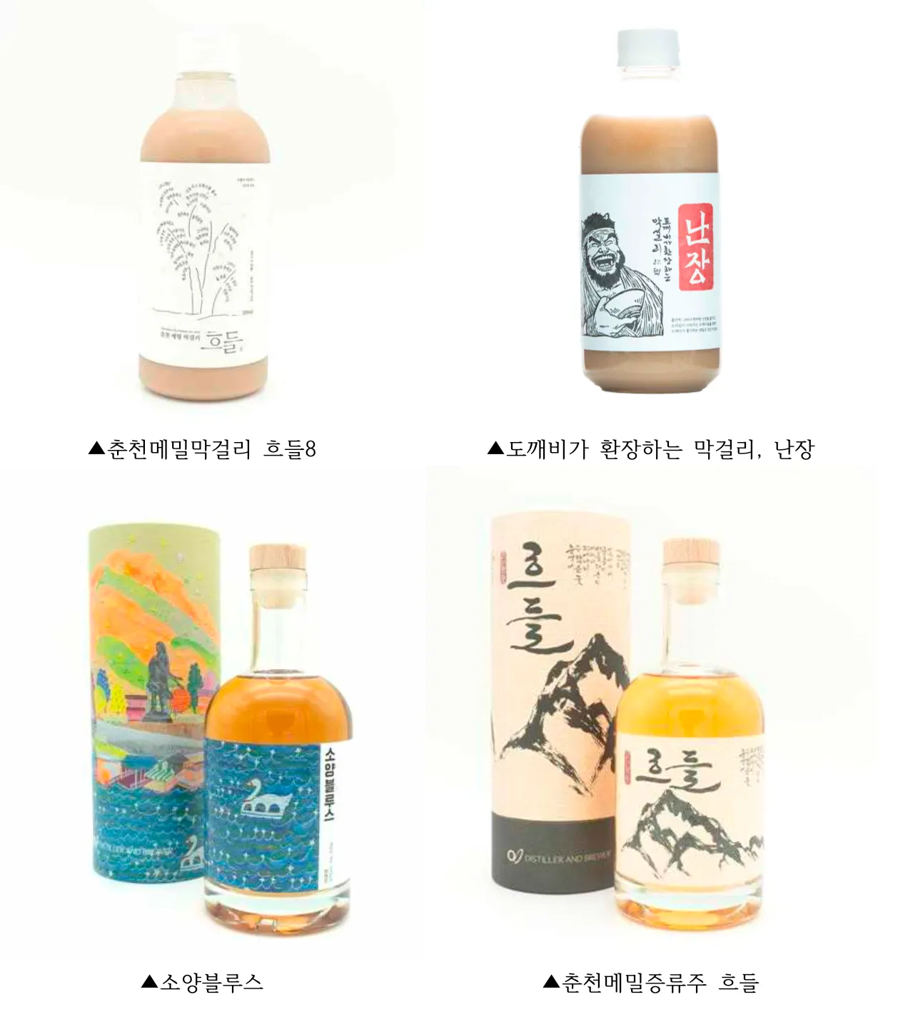 지금까지 출시된 제품은 춘천메밀막걸리 흐들8, 춘천마임축제 공식막걸리 '도깨비가 환장하는 막걸리, 난장', 레몬밤 리큐르 '소양블루스', 춘천메밀증류주 '흐들'이 있습니다. 특히 '도깨비가 환장하는 막걸리 난장은 춘천 마임축제를 만들고 즐기는 모든 이를 도깨비로 가정하고 있는데 도깨비가 메밀을 좋아한다는 설화 속 내용에 착안하여 개발하게 된 재미있는 비하인드 스토리가 있습니다.